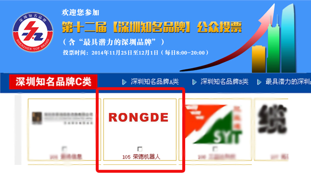 2014年,深圳市榮德機器人科技有限公司作為國家級高新技術企業,廣東省名牌產品,成功入選第十二屆“深圳知名品牌”評選活動,并定于2014年11月25日至12月1日(每天8:00-20:00)進行公眾投票,投票結果直接決定公司是否被評選上。所以特請各位朋友幫忙榮德公司投上一票。謝謝!投票具體規則如下: