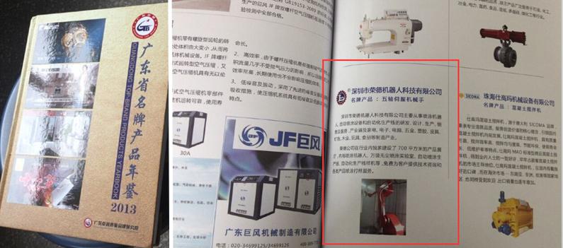 近日由廣東卓越質量品牌研究院出版的《2013廣東省名牌產品年鑒》,深圳市榮德機器人科技有限公司赫然在目。