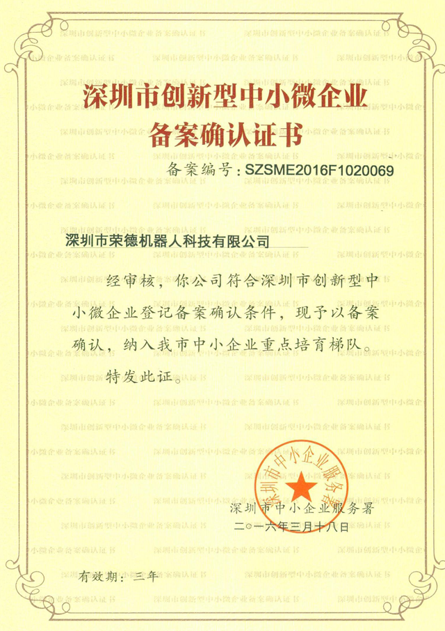 深圳市榮德機器人科技有限公司在2015年11月份提交了申請材料,經過三個月的嚴格審核,終于在2016年3月18日獲得了創新型中小微企業證書。