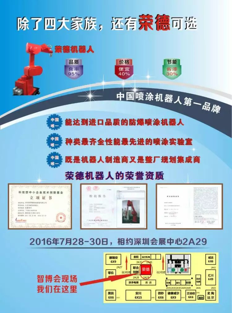 2016深圳國際智能裝備產業博覽會將于7月28日-30日在深圳會展中心拉開大幕,國產機器人唯一參展商--榮德機器人,將與國際機器人四大家族--日本安川、日本發那科、德國庫卡、瑞士ABB在二號館同臺亮相,榮德機器人在列強面前敢于亮劍,也熱烈歡迎新老客戶及各位朋友前往參觀指導。