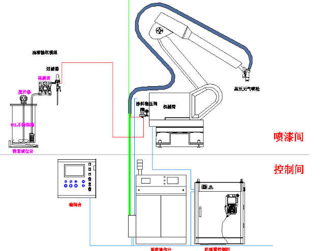 噴漆工位采用機械臂自動噴涂加人工補漆,其中人工補漆面積不能大于5%,應保證線上能同時自動噴底漆和自動噴面漆,不允許采用更換油漆管道分不同時段噴底漆或面漆。自動噴涂工位主要配置由噴涂機器人(防爆型,且具有示教功能)、供漆系統(高壓無氣供漆泵及管路,油漆調漆桶,儲漆桶,氣動攪拌器等)、高壓無氣自動噴槍、人工補漆系統及控制系統等組成。