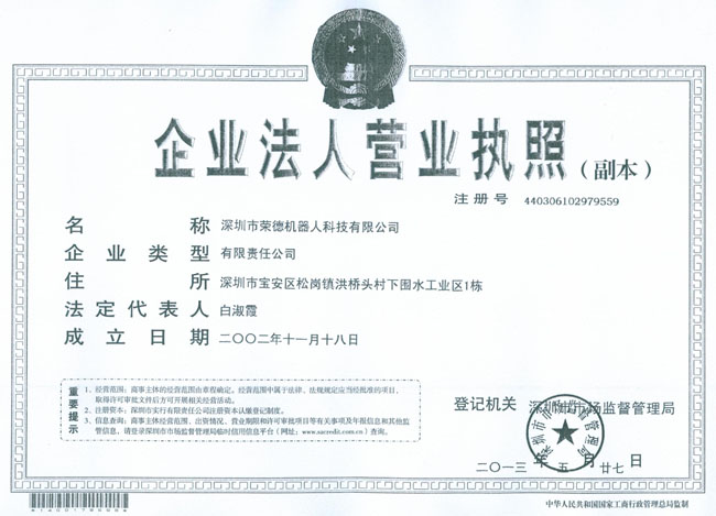 今天,全體榮德人見證了榮德發展歷史上重要的一刻:本公司由“深圳市榮德機械設備有限公司”正式更名為“深圳市榮德機器人科技有限公司”,注冊資本660萬元。
