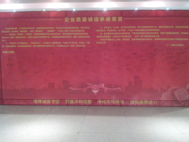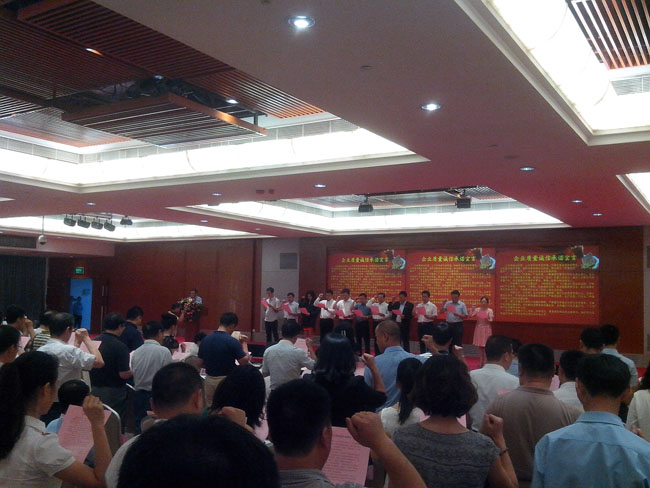 大會(huì)的高潮部分是所有與會(huì)的企業(yè)代表與政界代表一起舉起右手,宣讀《企業(yè)質(zhì)量誠(chéng)信承諾書》:為構(gòu)建誠(chéng)信經(jīng)營(yíng)、公平競(jìng)爭(zhēng)的市場(chǎng)環(huán)境,加強(qiáng)質(zhì)量誠(chéng)信體系建設(shè),切實(shí)保證產(chǎn)品質(zhì)量,維護(hù)消費(fèi)者的合法權(quán)益,推動(dòng)建設(shè)“質(zhì)量強(qiáng)國(guó)”,促進(jìn)“質(zhì)量強(qiáng)市”、“質(zhì)量惠民”。本企業(yè)向社會(huì)鄭重承諾:一、牢固樹立“質(zhì)量第一”的思想,不斷增強(qiáng)質(zhì)量意識(shí)和社會(huì)責(zé)任意識(shí),保證和提高產(chǎn)品質(zhì)量,落實(shí)企業(yè)質(zhì)量主體責(zé)任,滿足人們?nèi)罕妼?duì)高質(zhì)量產(chǎn)品的期待和需求,增強(qiáng)人民群眾的消費(fèi)信心。二、嚴(yán)格遵守《產(chǎn)品質(zhì)量法》、《標(biāo)準(zhǔn)化法》、《計(jì)量法》等法律法規(guī),嚴(yán)格執(zhí)行產(chǎn)品標(biāo)準(zhǔn),不制假、不售假,杜絕虛假宣傳,堅(jiān)決抵制假冒偽劣、欺詐消費(fèi)者等失信違法行為,不侵害其他企業(yè)合法權(quán)益。三、加強(qiáng)全員、全過程、全方位的質(zhì)量管理,推行先進(jìn)質(zhì)量管理方法,完善計(jì)量保證體系、標(biāo)準(zhǔn)化體系和質(zhì)量保證體系,嚴(yán)格原材料,生產(chǎn)過程、產(chǎn)品出廠和儲(chǔ)運(yùn)銷售全過程的照顧質(zhì)量控制。四、建立質(zhì)量安全事故主動(dòng)報(bào)告制度,嚴(yán)格落實(shí)質(zhì)量安全責(zé)任追究制度,完善產(chǎn)品質(zhì)量追溯體系,及時(shí)解決消費(fèi)者的質(zhì)量投訴,自覺履行產(chǎn)品質(zhì)量召回、“三包”等產(chǎn)品質(zhì)量責(zé)任和義務(wù)。本單位嚴(yán)格履行以上承諾。如有違反,愿意承擔(dān)相應(yīng)的法律責(zé)任,接受將失信違法行為納入不良信用記錄并向社會(huì)公開。二0一四年九月五日