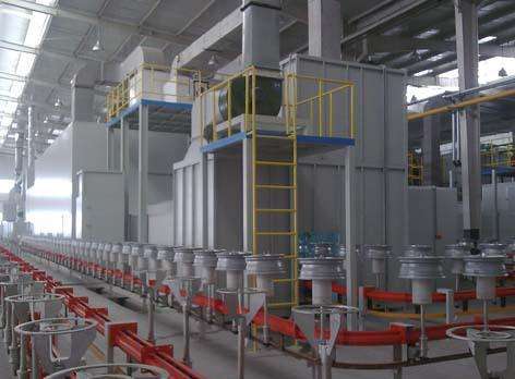 涂裝生產(chǎn)線主要工藝流程是上件→拋丸除銹→清理吹灰→噴鋁→底漆噴漆流平→底漆烘干→中涂噴漆流平→中涂烘干→面漆噴漆流平→面漆噴漆烘干→下件。涂裝線的防腐環(huán)境是室外(不直接淋雨),高架橋腹部波紋板。保護(hù)年限為長(zhǎng)效型,50年。主要針對(duì)工廠構(gòu)件外表面涂漆,不考慮施工后涂裝。前處理拋丸,Sa3.0級(jí)、粗糙度/75-120um、清潔度/1級(jí)。基材涂層為電弧熱噴鋁,120-150μm;底涂層為環(huán)氧富鋅底漆,60-80μm,90℃60分鐘烘干。中間涂層為環(huán)氧云鐵中間漆,150-180μm;90℃90分鐘烘干。 面漆為丙烯酸聚氨酯或氟碳漆面漆,40-60μm。90℃60分鐘烘干。總漆膜厚度:≥250μm。