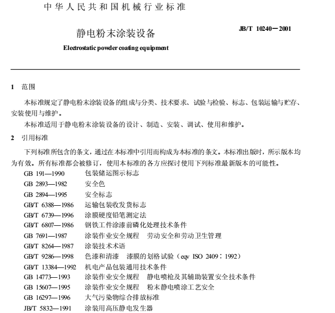 噴涂行業(yè)標(biāo)準(zhǔn)《靜電粉末涂裝設(shè)備》JB-T10240-2001